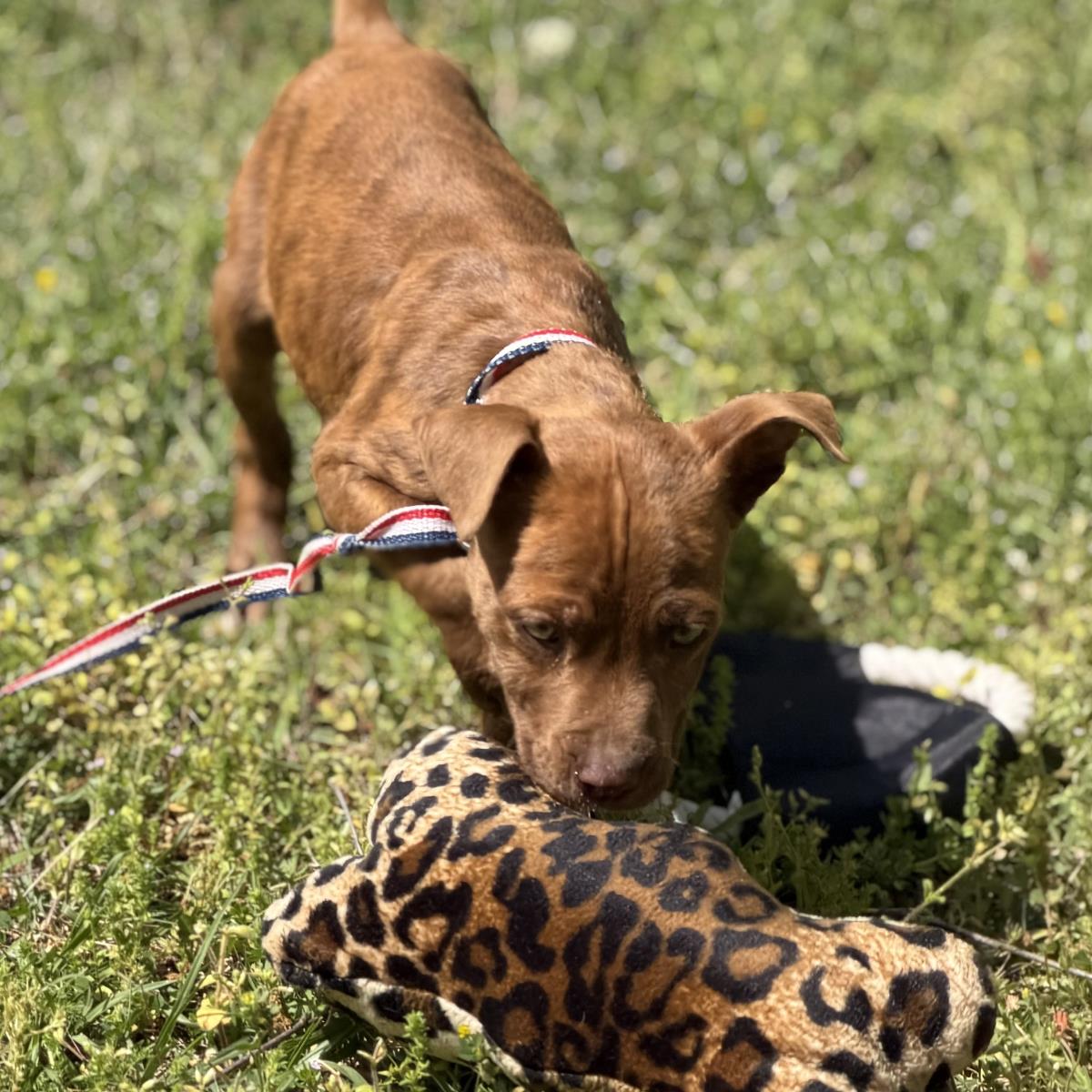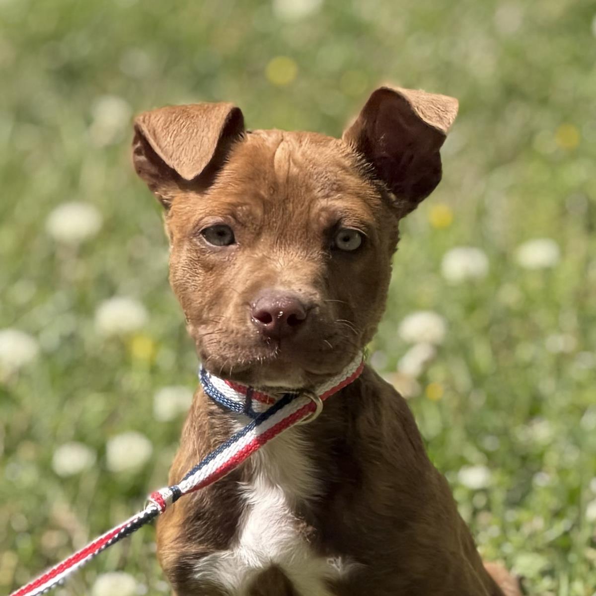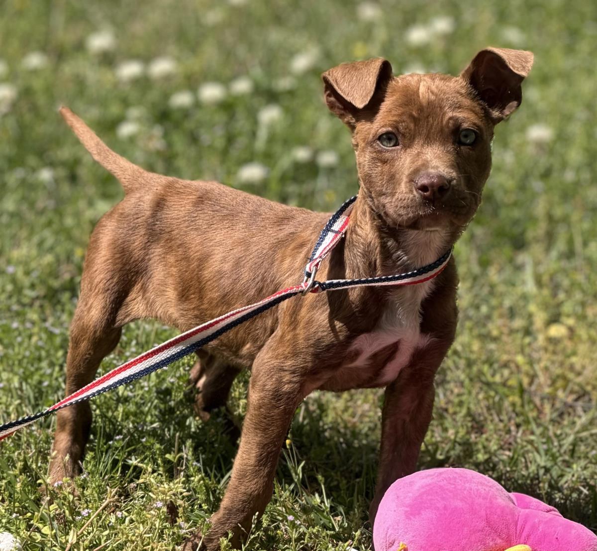 Who loves to be held? Eggie, Thumper, Sunday, and Hopper, that’s who! Three-month-old Boxer mixes, these four pups weigh 8-10 pounds now and will mature to around 40 pounds. They’re super sweet, playful, energetic, dog friendly, toy loving and very goofy! A delightful litter, these little ones spend their time rolling around and chasing each other having as much fun as they can! Terrific! (posted 4/16/26, ME)