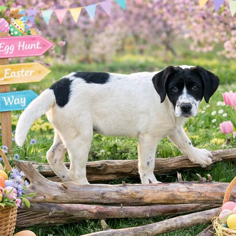 Oh, my goodness!! What a wonderful litter of six! Four months old, these Border Collie/Lab mixes weigh 25-30 pounds and will grow to between 60 and 70 pounds when they mature. They are good with other dogs, kids, and their foster’s cat! Just watch them as they frolic in the play yard, tumbling and chasing. Then see how they plop into puppy naps, waking up ready to race around again! Delightful! (posted 3/7/26, TN)
