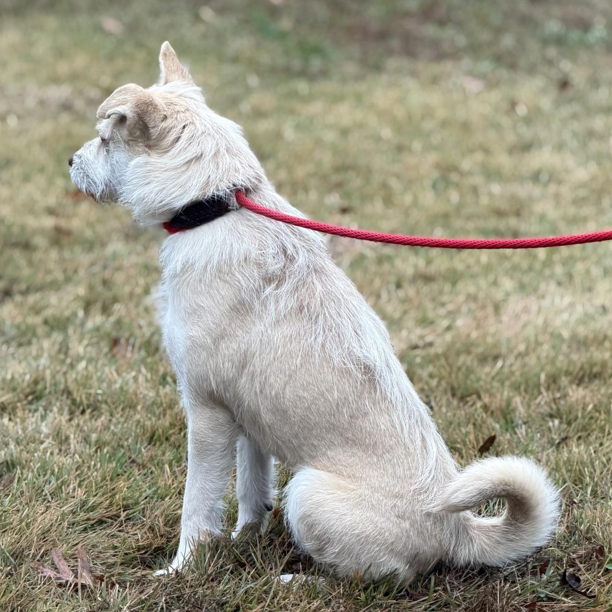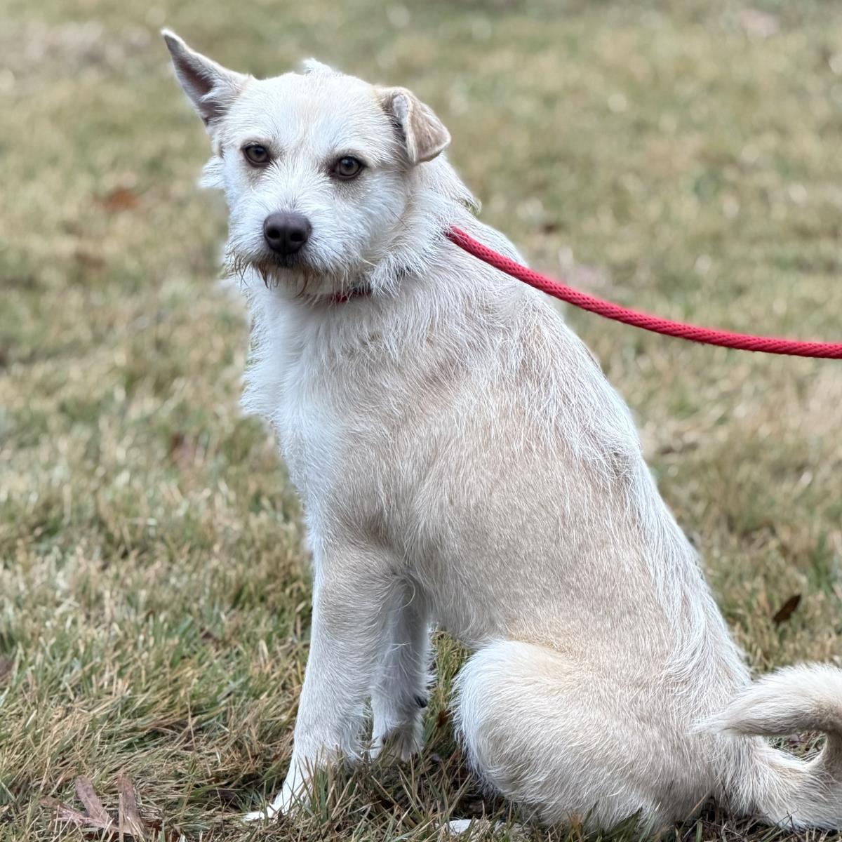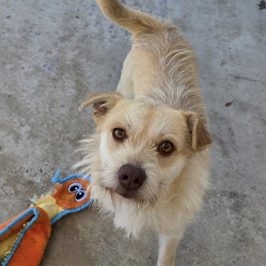 Ella is the sweetest girl ever! She’s a 1-year-old, 30-pound Cairn Terrier mix with a scruffy tan coat and a loving personality. Although she might be a bit shy at first, she soon relaxes and settles into a calm life with playful dogs. She prefers not to be around rambunctious ones which usually reflect a more active lifestyle than she likes. But she’s no couch potato which you’ll quickly see as she climbs up a wired fence! A delightful girl! (posted 12/16/25, ME)