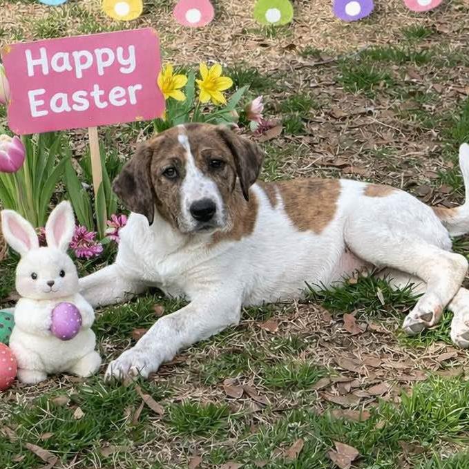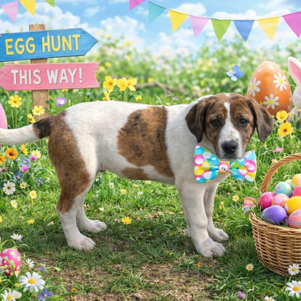 Oh, my goodness!! What a wonderful litter of six! Four months old, these Border Collie/Lab mixes weigh 25-30 pounds and will grow to between 60 and 70 pounds when they mature. They are good with other dogs, kids, and their foster’s cat! Just watch them as they frolic in the play yard, tumbling and chasing. Then see how they plop into puppy naps, waking up ready to race around again! Delightful! (posted 3/7/26, TN)