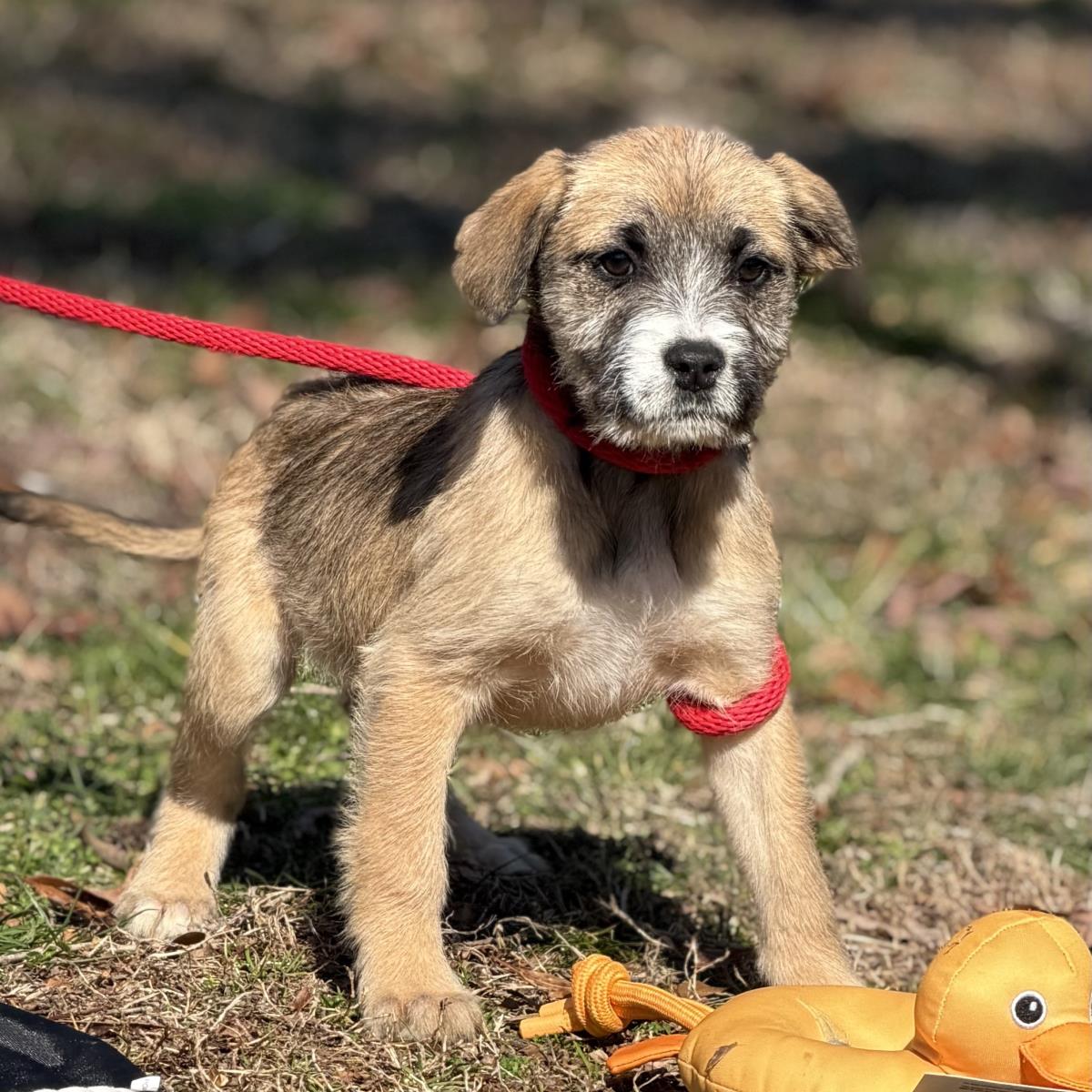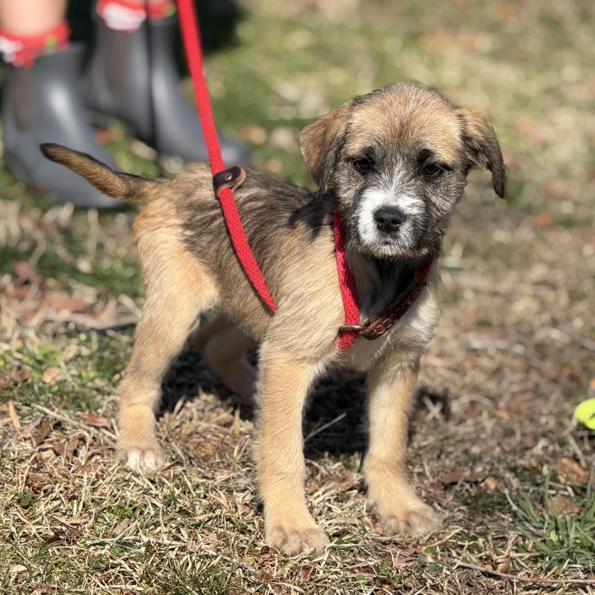Meet our 7-pup litter of Schnauzer/Lab mixes! At three months old, they weigh 10 to 12 pounds and will mature to around 45 pounds. These babies are described by their foster as sweet, friendly, and vocal. They love to lie with their kennel mates and cuddle, so they’re obviously dog friendly. And they share their food well. Their names? Here we go! Gandalf, Frodo, Bilbo, Sauron, Eowyn, Arwen, and Aragorn. Phew! Here they are! A great group of pups! (posted 2/13/26, ME)