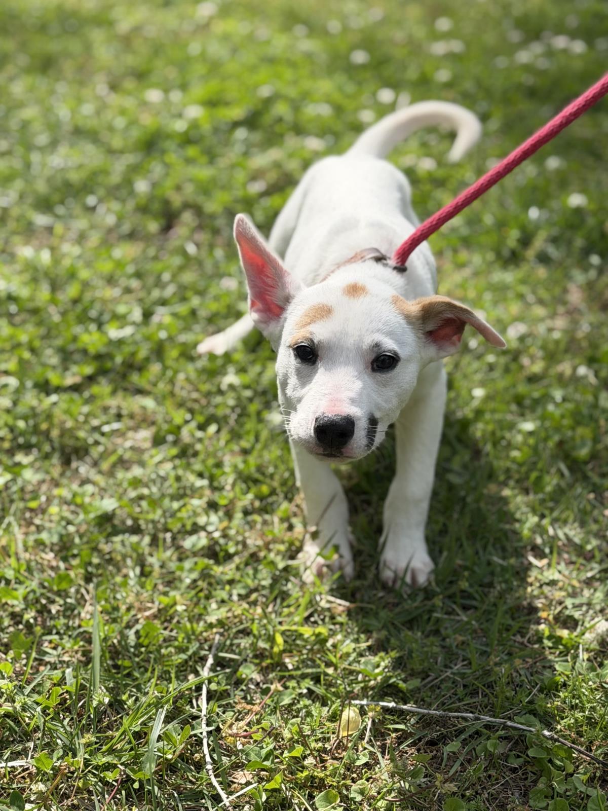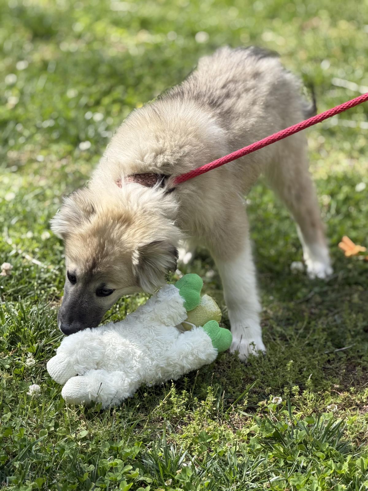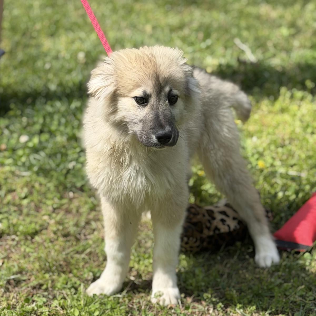 Some litters are small, some are large, really large! Like this one. Their names are Hart, Cupid, Valentino, Amis, Eros, Amore, Valentina, Valerie, and Dove! You counted right! There are nine of these three-month-old Great Pyr/Shepherd mixes who presently weigh 10 pounds and will grow to 60 or more. Aside from how many there are, what are their personalities? They’re super sweet, very loving, with medium energy. They love to run and play, especially with toys. These fluffy babies are dog friendly and food friendly, too! A delightful litter of nine! (posted 4/16/26, ME) Adoption Fee: $395.00-- covers microchip, worming, all vaccines, monthly heart worm preventative, monthly tick/flea preventative, spaying/neutering, health certificate, and complete medical records. Transport Fee: $160.00-- We consider the transport to be of great importance and, as such, take particular care of the dogs during the trip. We make every effort to arrive with healthy and minimally stressed dogs. **It is rare that we know with certainty the ages or mixes that make up our dogs, but we do our best to be as accurate as possible based upon our experience. **