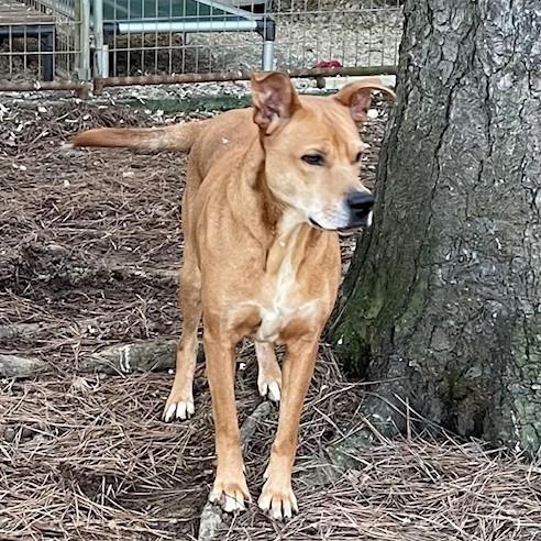 This is Massey. He is a 1 1/2-year-old Labrador/ German Shepherd mix. There may be some other breeds in there of course. He’s what my dad would call a Heinz 57 mix…. A little of this and a little of that. Massey weighs about 50-60 pounds and has short slick fur. He’s a wonderful dog with a winning personality. He is house trained, crate trained and very loving. He spent the last 6 months to a year living in a one-bedroom apartment with another large dog and a cat. I think he would do fine with either, given proper introduction. He has not been around small children so I’m not sure how he is with that. Massey has a good bit of energy and loves to snuggle, like he will want to sleep with you if you let him. Unfortunately, his owner can no longer care for him due to poor financial decisions, so he is here with me, his foster mom. I’ve grown to love him, but he deserves more than kennel life. Perhaps his sweet face will speak volumes for him and touch your heart. (posted 2/15/26, HS)