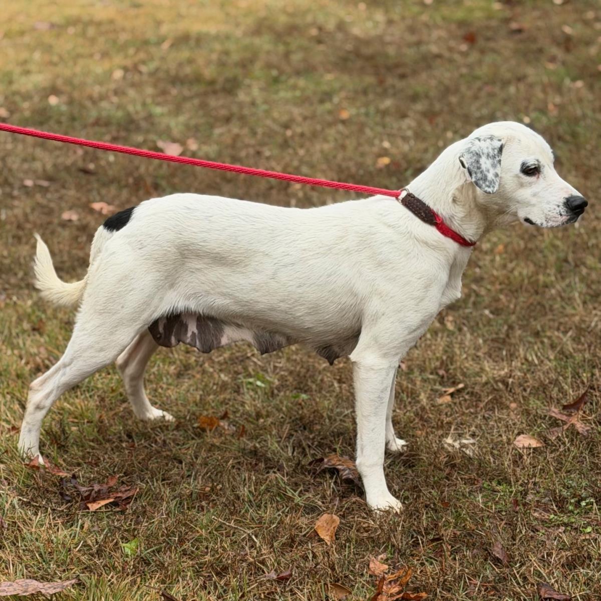 Despite her colors of only white and black, we decided to call this girl Rainbow because of her colorful personality! An 8-month-old mix of Lab and Retriever, she presently weighs 34 pounds and will mature to between 45 and 50. Rainbow has 6 pups and has proven to be a wonderful mama dog. A Velcro dog, she’s active and super loving, loves toys and loves to play with other dogs. Remember, she may have 6 pups, but at 8 months she’s still a puppy herself. A darling dog! (posted 12/16/25, ME)