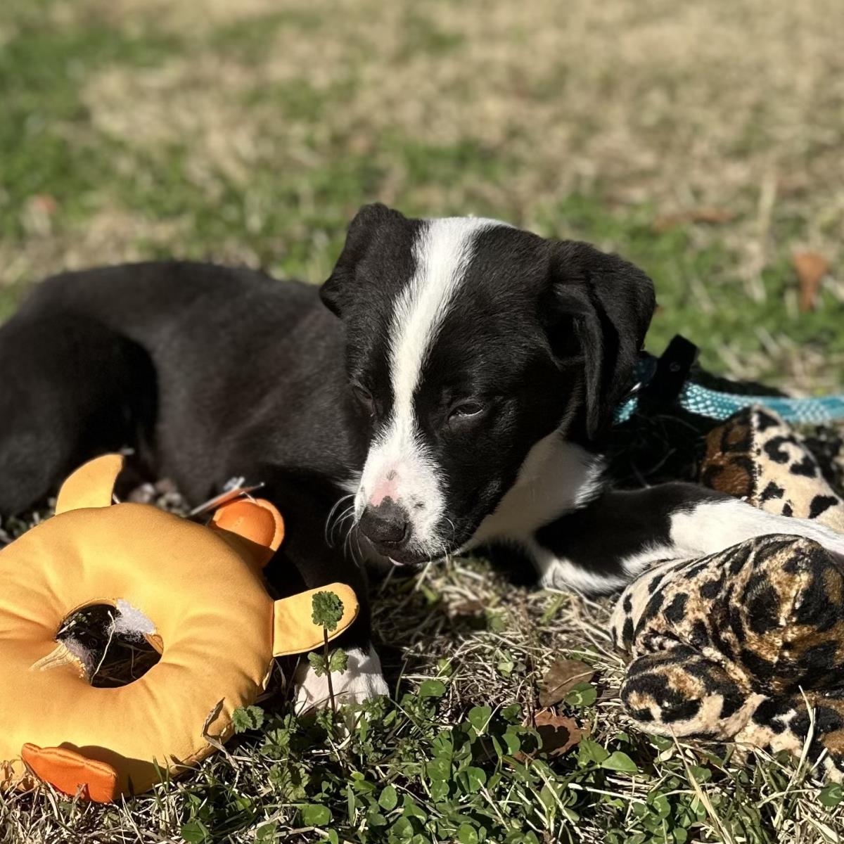 Pearl, Smokey and Stormy are delightful siblings with sparkling personalities. Lab mixes, they presently weigh 8-10 pounds and will mature to about 50. These three sibs are sweet, fun, playful and very energetic. They are very dog friendly and love to spend time racing around the play yard until they have to plop down into puppy naps before starting all over again. Terrific pups! (posted 3/7/26, ME)